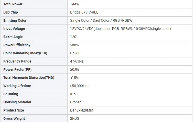 Illuminate your boat or yacht with the 144W RGBW Marine LED Underwater Light, designed for durability, performance, and style. Its IP68 waterproof rating ensures reliable operation underwater, while the bronze housing and tempered glass cover provide corrosion resistance and long-lasting performance in marine environments.