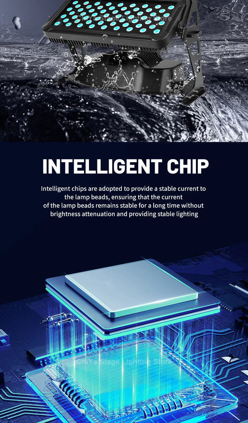 Bring professional brilliance to your stage or outdoor event with the 120W RGBW Double Layer Waterproof Floodlight. Featuring RGBW 4-in-1 LEDs, this powerful lighting fixture delivers vibrant color mixing, intense brightness, and dynamic effects—perfect for DJs, concerts, weddings, festivals, and large-scale performances.