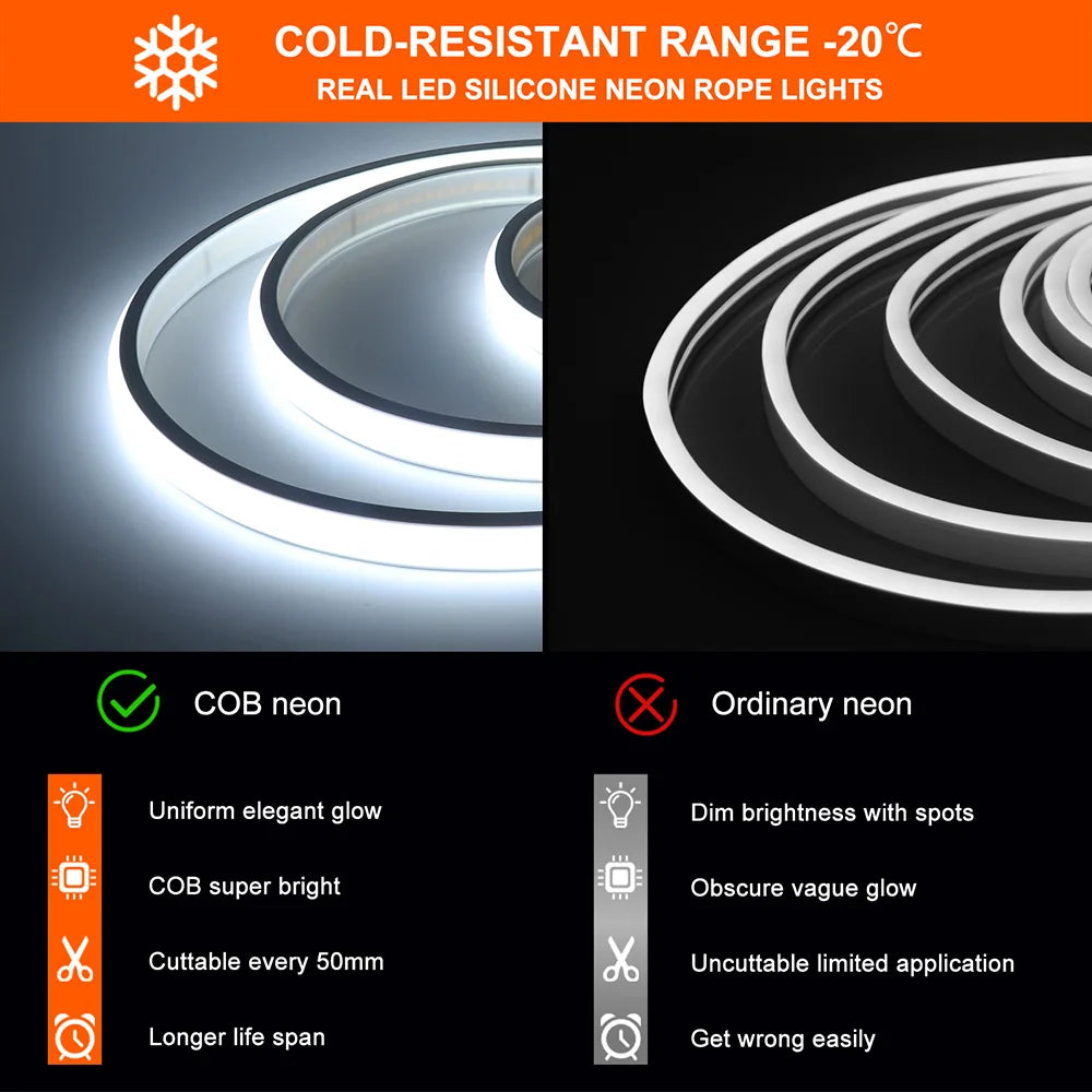 Experience premium linear lighting with this IP68 waterproof COB LED neon strip. Featuring 320 LEDs per meter and Epistar SMD2835 chips, it delivers consistent, high-density illumination across 3000-6000K color temperatures. The flexible design supports both 12V and 24V operation with dimmable control, consuming just 11.52W per meter for energy efficiency. Fully certified and rated for 50,000 hours, this professional-grade strip handles indoor and outdoor applications with complete waterproof protection. Ideal for architectural accents, ambient home décor, and commercial installations requiring reliable, long-lasting performance.
