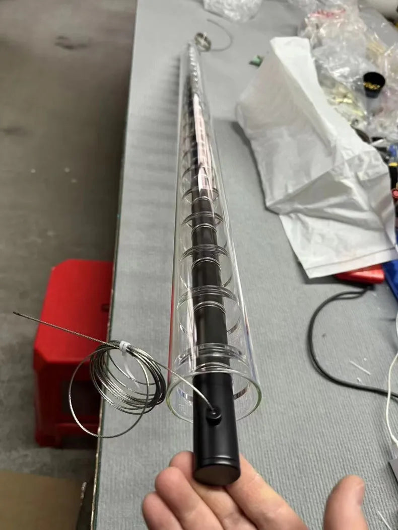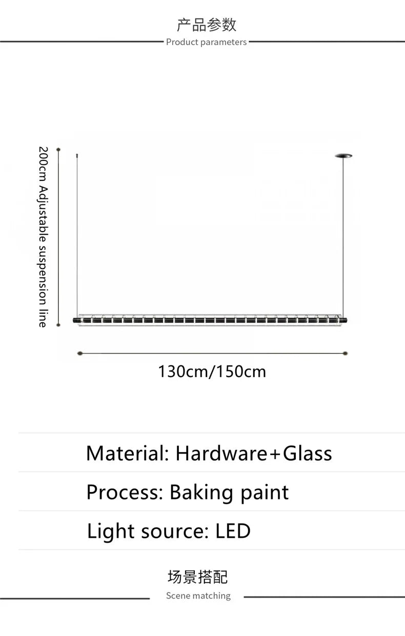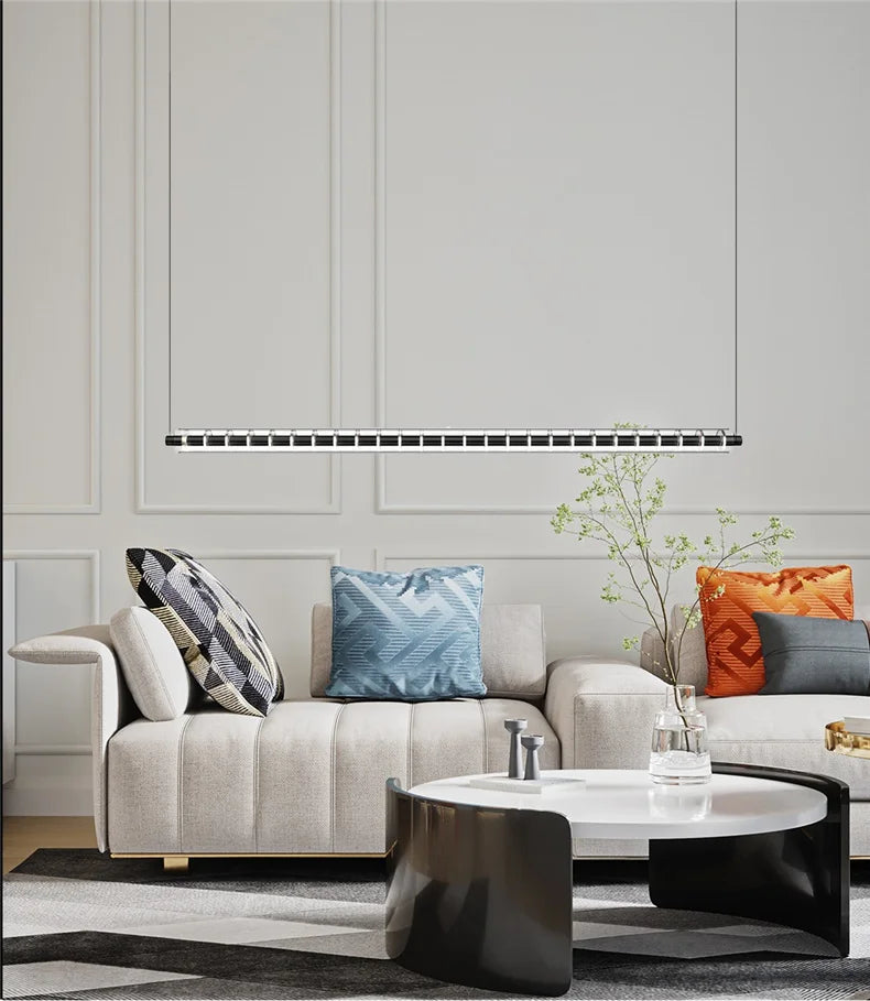 Elevate your interiors with this minimalist long glass chandelier, a perfect blend of modern elegance and artistic design. Crafted with a polished chrome finish and sleek clear glass elements, this linear LED pendant light creates a sophisticated atmosphere for dining areas, kitchen islands, bars, and living rooms.